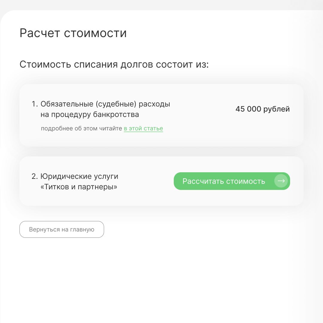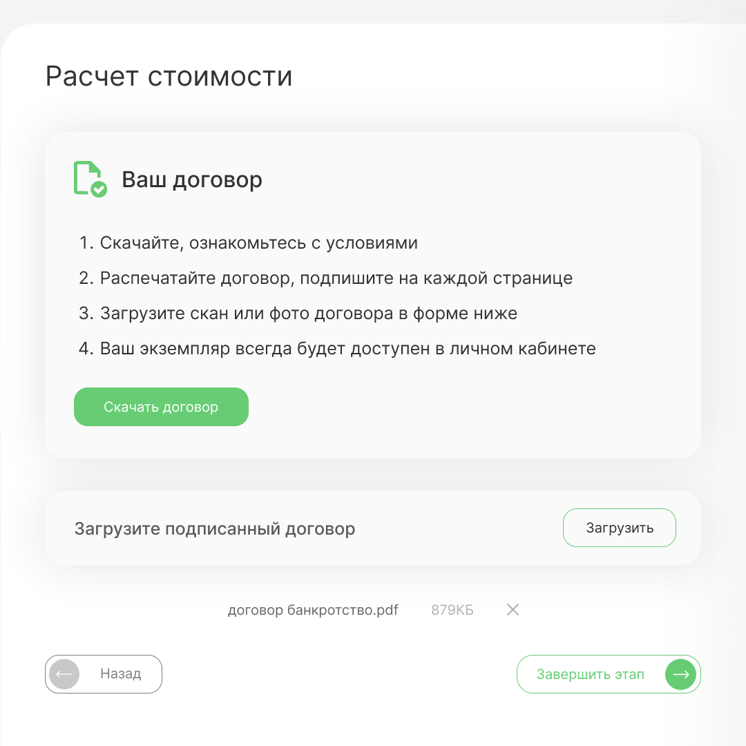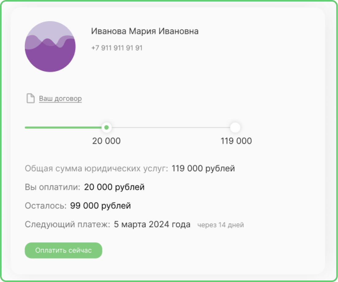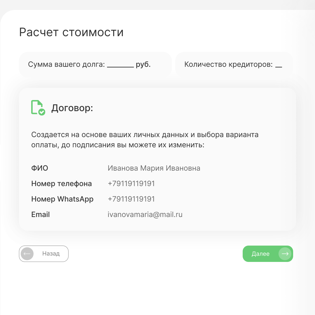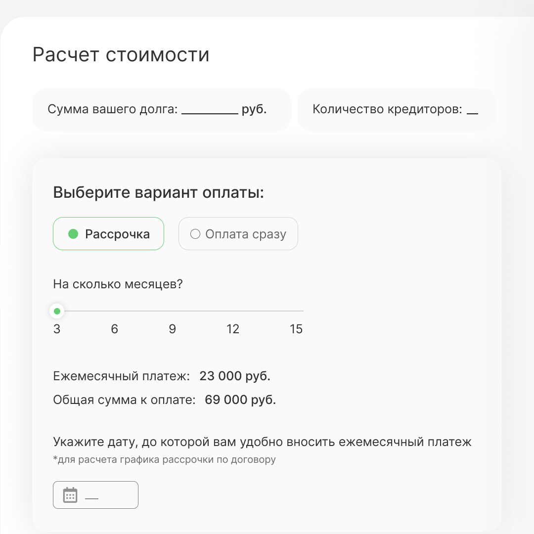 Сначала вы выбираете комфортную для вас оплату юридических услуг. Самый выгодный вариант - оплата сразу. Но если вам комфортно платить маленькими частями - мы сделали рассрочку на 3/6/9/12/15 месяцев.. На основе вашего выбора формируется договор, если вы пока не готовы его сделать - оставьте на потом. Судебные расходы оплачиваются отдельно, об этом читайте по