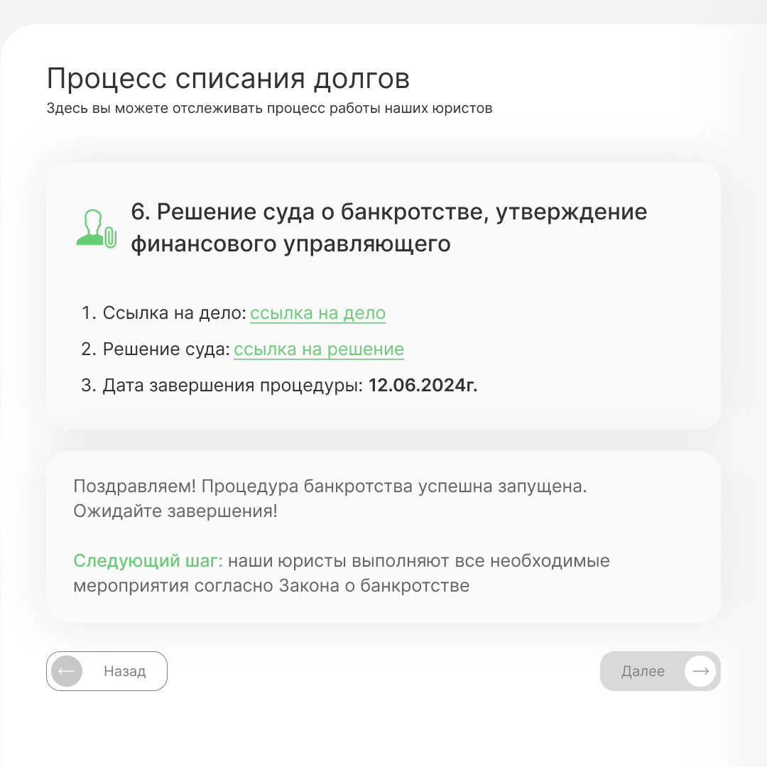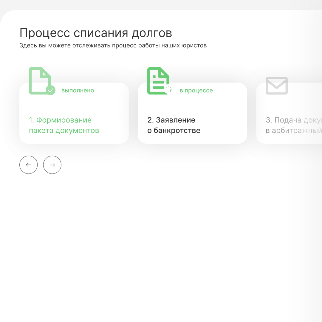 Удобное отслеживание вашего дела - вы всегда можете посмотреть, на каком оно этапе и что будет дальше. Внутри каждого этапа вы увидите документы.