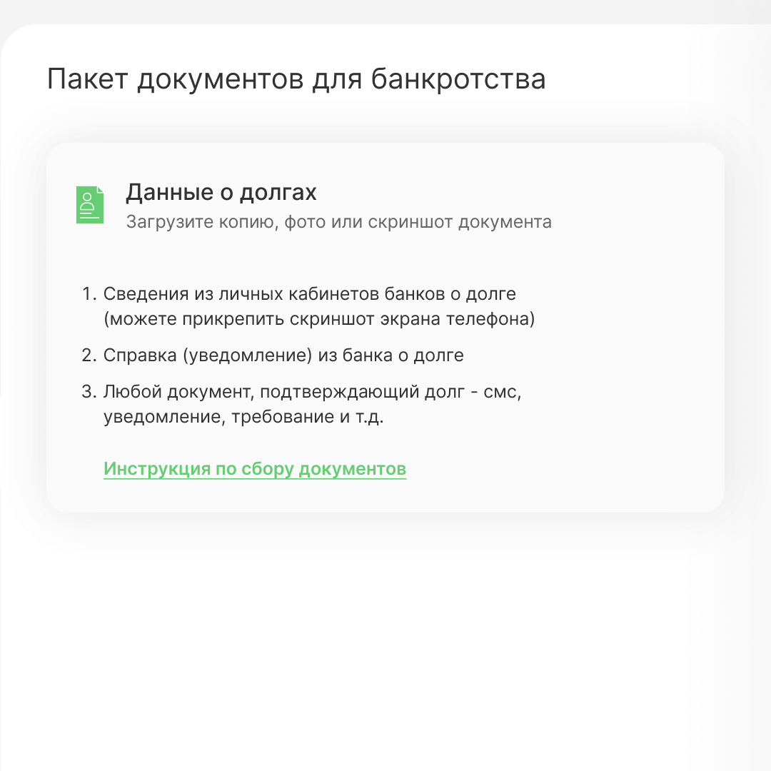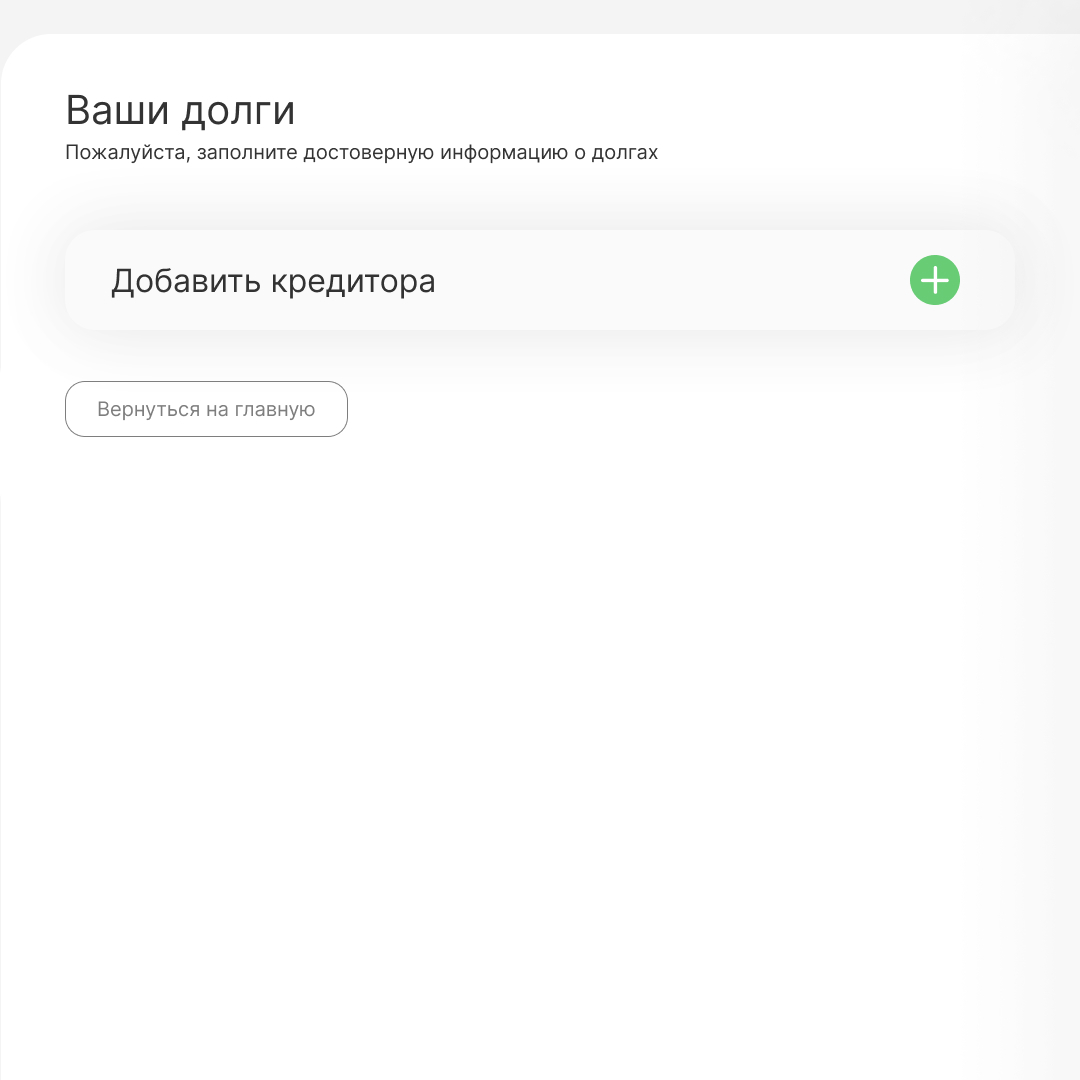 Чтобы дать вам ответ на вопрос - подходите ли вы под банкротство, нам нужно ознакомиться с вашими долгами. Добавляйте каждого кредитора по очереди. Если не знаете точную сумму долга, пишите примерную.