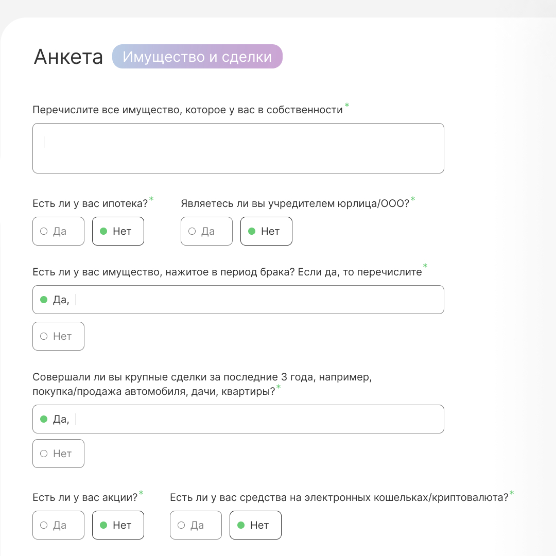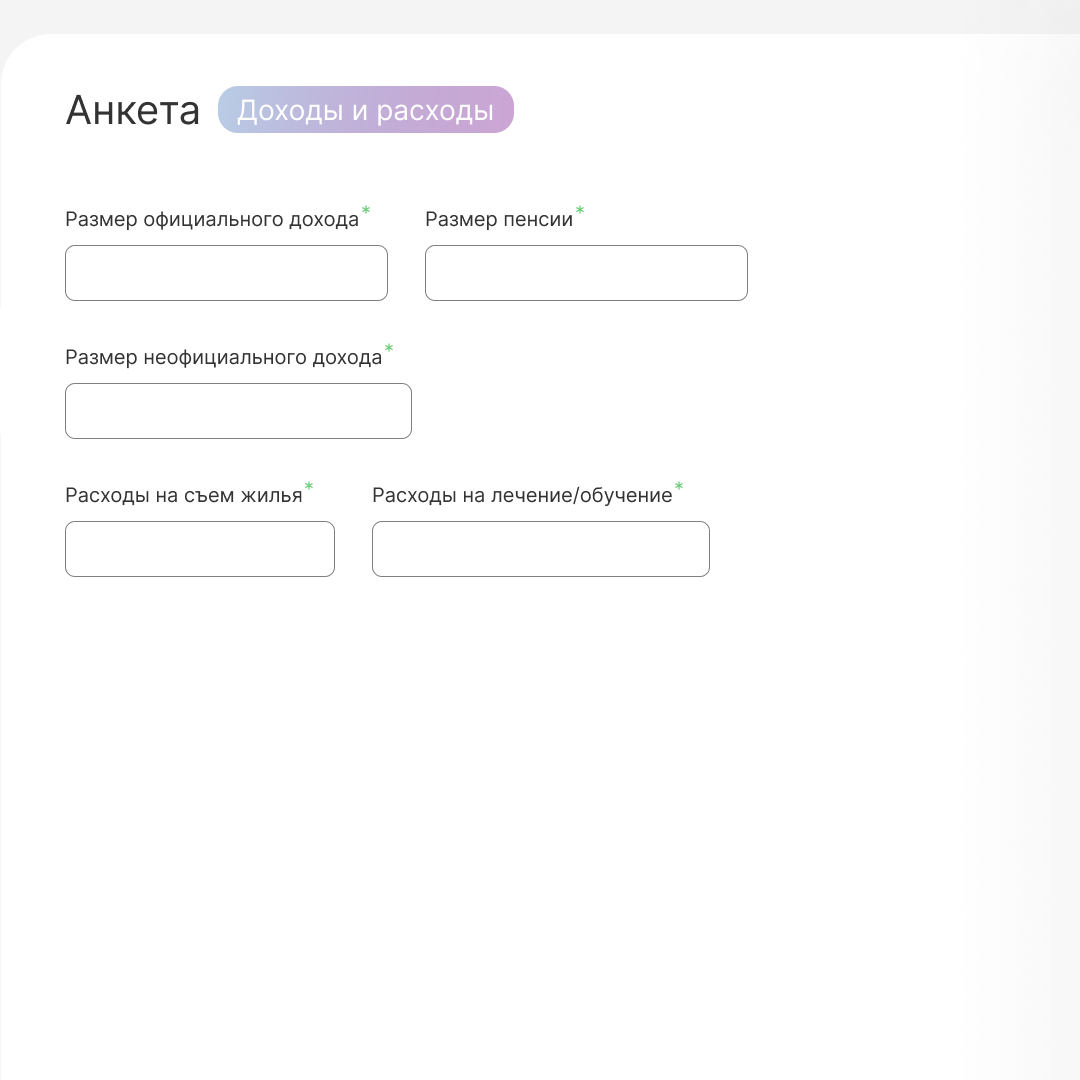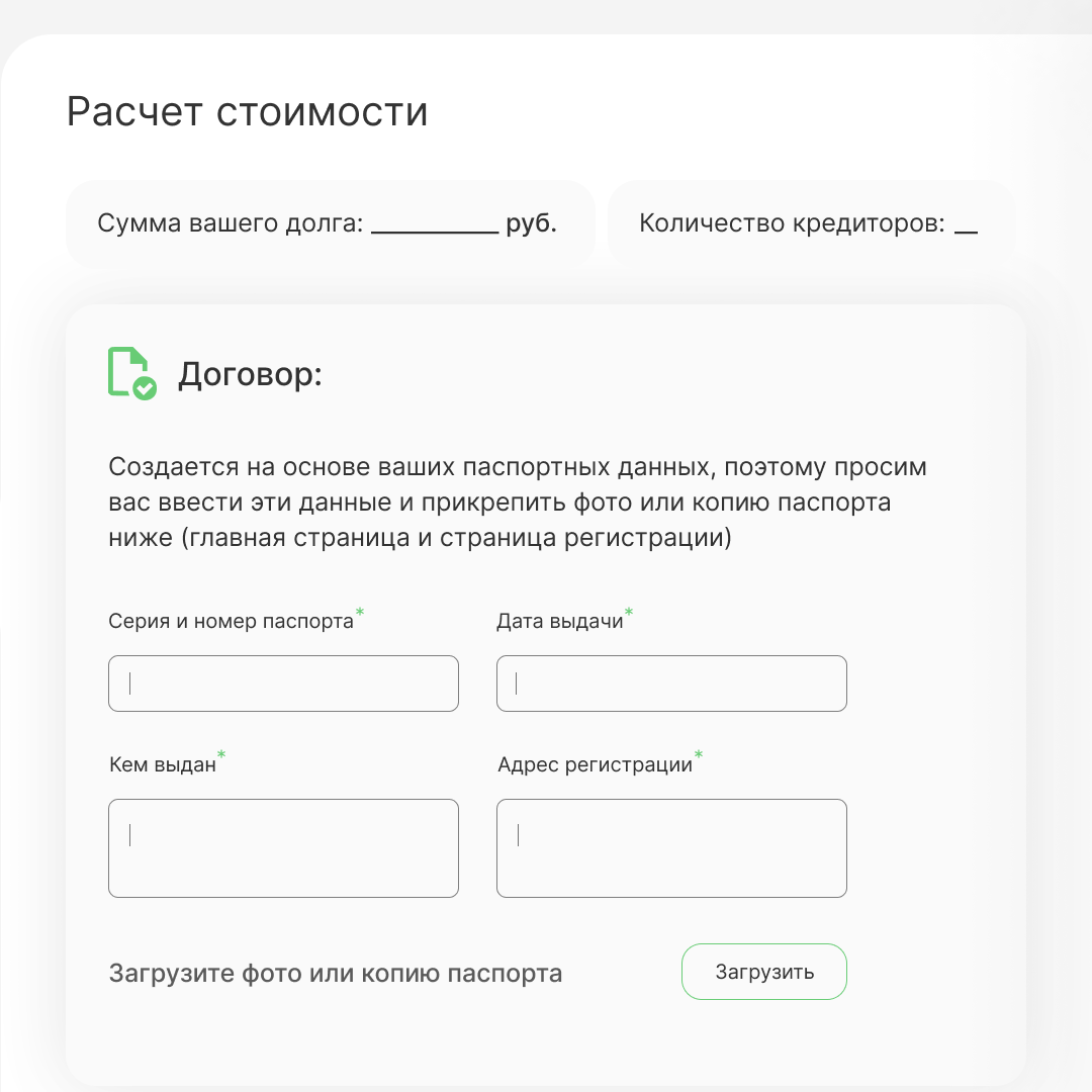 Здесь вам нужно заполнить ваши личные данные, информацию о ваших доходах и имуществе - все это необходимо нашим юриста для анализа вашей ситуации. Паспортные данные не требуются.