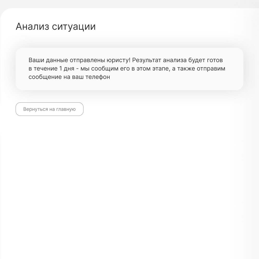 Когда вы заполнили первые два этапа, то отправляете данные юристу, он все изучает и дает вам ответ конкретно по вашей ситуации. Также рассказывает, как сохранить ваше имущество (если оно у вас есть), что делать с доходами и отвечает на все ваши вопросы. Если вы подходите под банкротство, то вам открывается следующий этап.